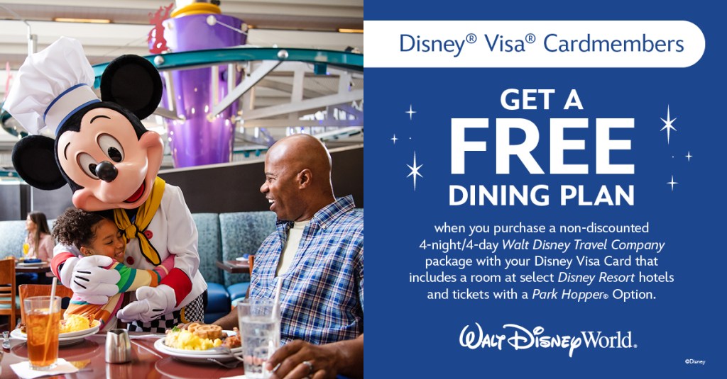 Enjoy a FREE dining plan when you use your Disney Visa Card to purchase a minimum 4-night, 4-day Walt Disney Travel Company package (room & park hopper tickets)—for arrivals most nights from: July 1 to July 31, 2024, September 1 to September 7, 2024 and December 9 to December 21, 2024