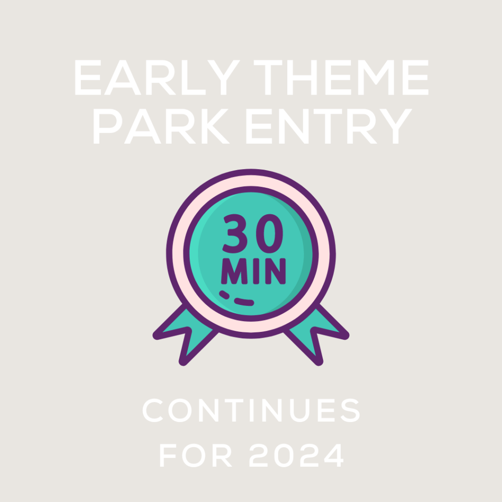 For those planning to stay at a Disney Resort hotel, the popular early theme park entry will continue for visits through 2024. This great benefit gives Guests a jump start on their day. For those staying at Disney Deluxe Resorts and Deluxe Villas, extended evening hours on select dates at select parksย will continue through 2024. Early theme park entry and extended evening hours require valid theme park admission and Resort ID.